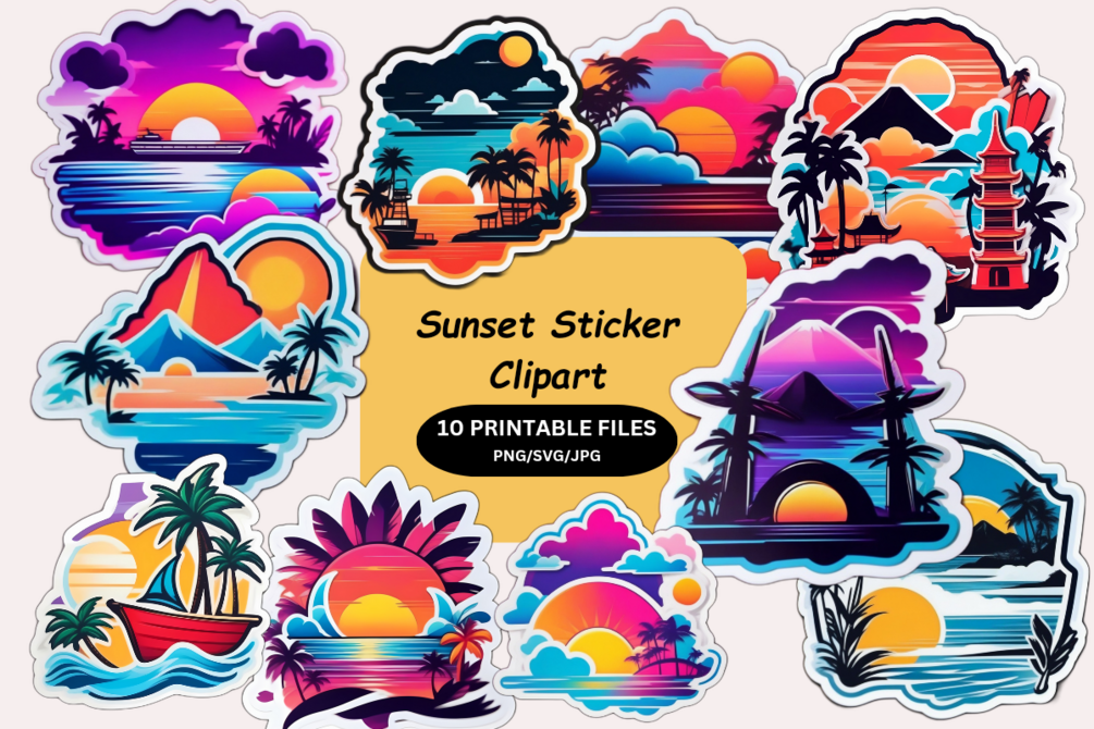 This contains 10 sunset printable digital stickers. This clipart designs can be used to produce printables, website illustrations, book covers and other apparel.